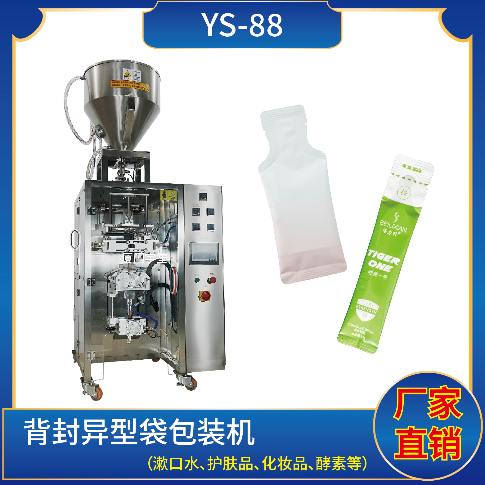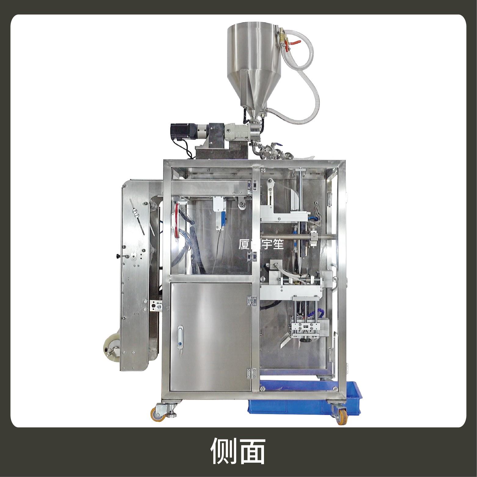 適用于食品、醫(yī)藥、化工、化妝品行業(yè)中液體、醬料等物品的異形袋計量包裝。可自動完成制袋、計量、下料、封合、分切、計數(shù)、且可根據(jù)客戶要求配置打印批號等功能。